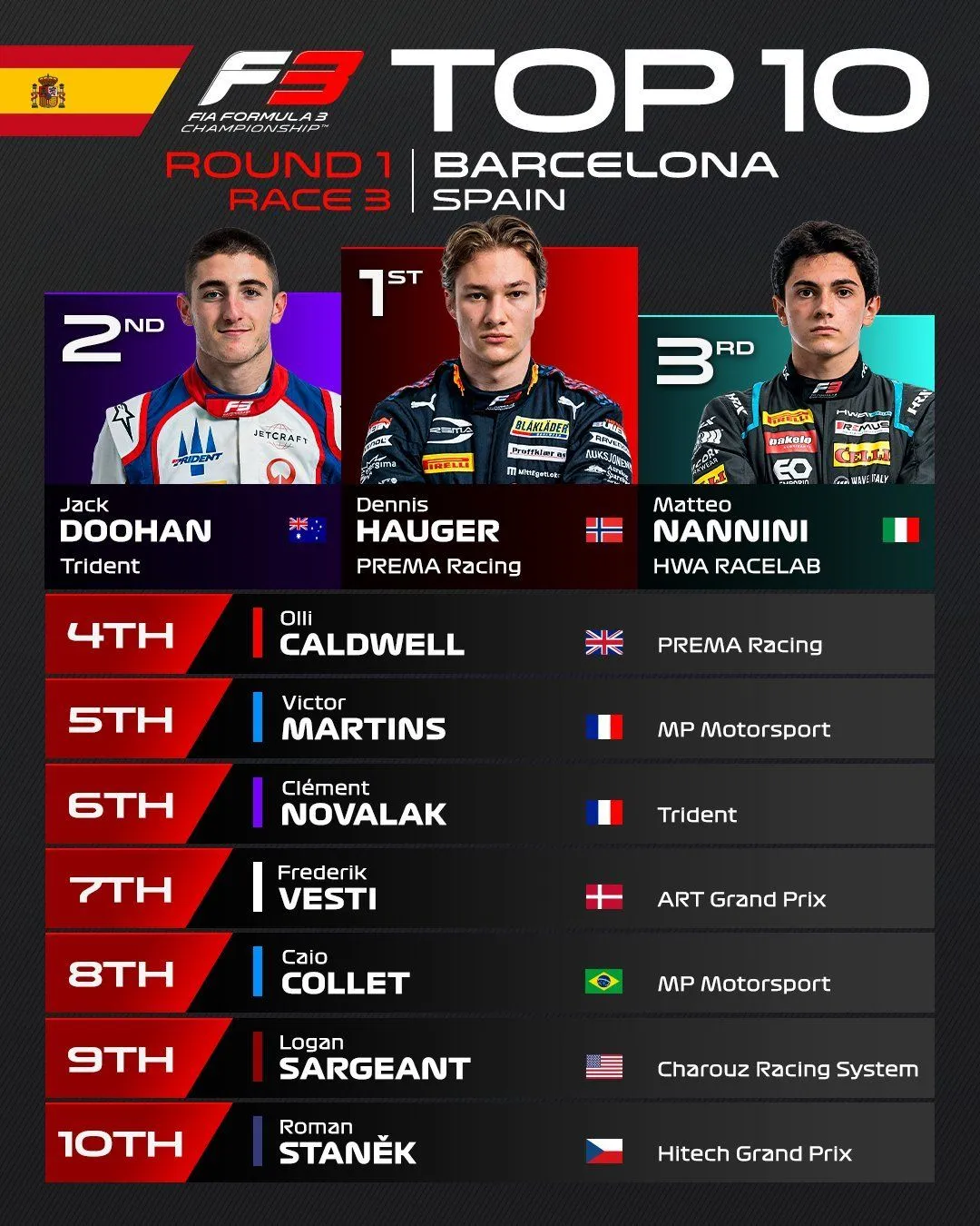 Provisoirement deuxième, Jack Doohan est suivi par un cortège d’une dizaine de monoplaces prêtes à bondir à la moindre erreur. Devant, le pilote de la Red Bull Junior Team, Dennis Hauger, s’en va seul chercher la victoire. Sous pression et en souffrance depuis quelques tours, Martins se fait dépasser par le vainqueur de la course 2, Olli Caldwell. Puis c’est au tour de Novalak et de Vesti de profiter d’une sortie Sargeant pour remonter dans le top 10. Leader du début à la fin, Dennis Hauger aura parfaitement géré sa course et s’adjuge ainsi sa première victoire et le meilleur tour. Jack Doohan et Matteo Nannini complètent le podium. Côté français Martins, finit cinquième, une place devant Novalak. Reshad de Gerus et Pierre-Louis Chovet terminent respectivement 23e et 24e.