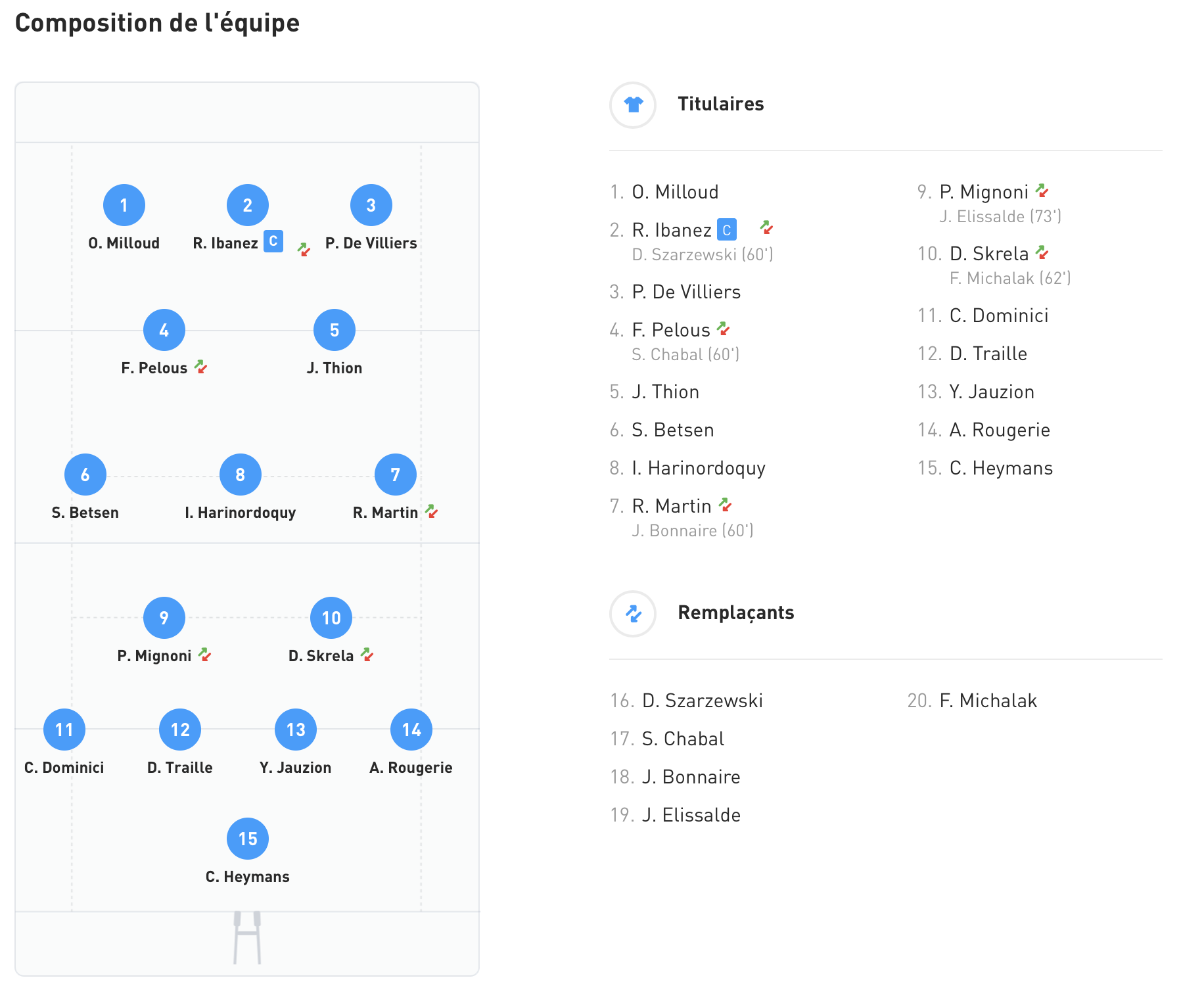 Dès lors, les Français essayent de se remettre la tête à l'endroit par des lancements de jeu simples : hélas, pour un Bleu, il y a au minimum 3 ou 4 défenseurs Ciel et Blanc, qui plongent sur le porteur pour ralentir systématiquement la sortie, profitant de la mansuétude arbitrale.