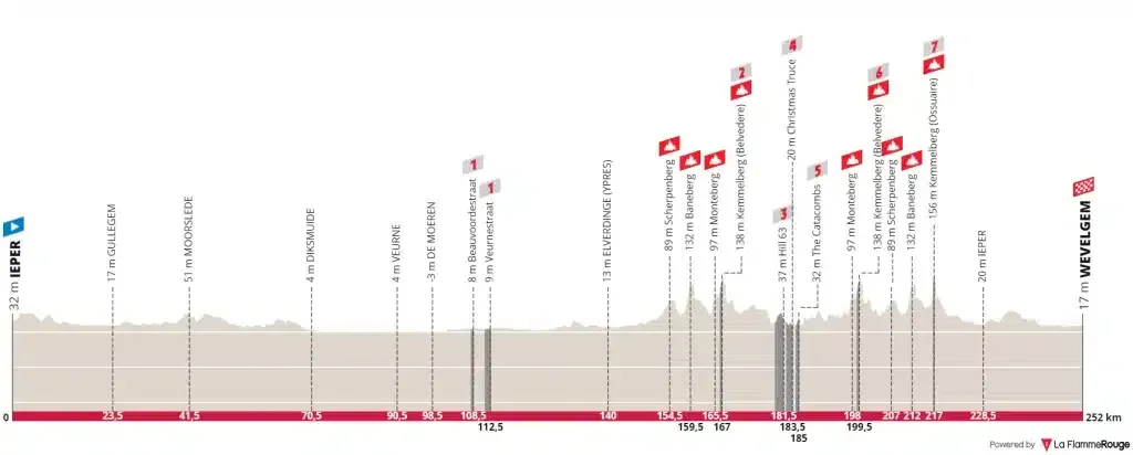 La première partie de la course est relativement plate et les premiers secteurs pavés interviendront après 108 kilomètres. Pour retrouver les premiers monts répertoriés, il faudra patienter 154 kilomètres avec l’ascension de Scherpenberg. À partir de là, il n’y aura quasiment plus 1 mètre de plat pendant plus de 60 kilomètres. La dernière partie de l’étape semble plus simple après la montée du Mont Kemmel, dernière ascension répertoriée.