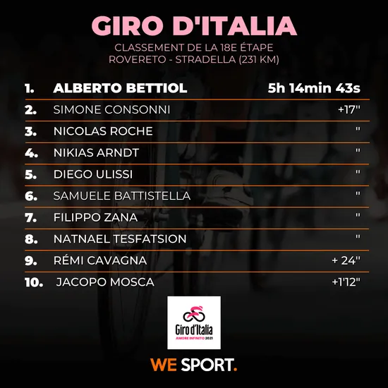 Cette 18e étape représentait la dernière chance pour les sprinters sur ce 104e Giro. Cependant, le peloton a laissé filer et c’est l’échappée qui s’est disputée la victoire dans les petites bosses menant à Stradella. Pour la plus longue étape de ce Giro, les coureurs ont parcouru les 231 kilomètres entre Rovereto et Stradella. L’étape est plate jusque dans les trente derniers kilomètres où des bosses sont venues semer la zizanie au sein des équipes se disputant la victoire. Après la chute et l’étape compliquée hier, Remco Evenepoel (Deceuninck Quick-Step), Nick Schultz (BikeExchange) et Giulio Ciccone (Trek-Segafredo) n’ont pas pris le départ ce matin. La météo est clémente aujourd’hui et le soleil viendra éclairer les coureurs sur l’ensemble de la journée.
