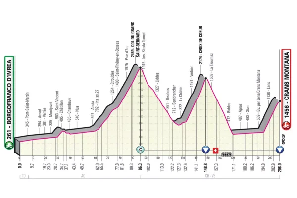 La première ascension est la plus élevée, avec les 34 km du Gran Saint Bernard qui s'élèvent de la route de la vallée à 2469m pour attribuer le prestigieux prix Cima Coppi au premier coureur qui franchira le sommet de la plus haute ascension de la course. La pente est constante à 5,5 %, mais elle est aussi longue de 34 km.