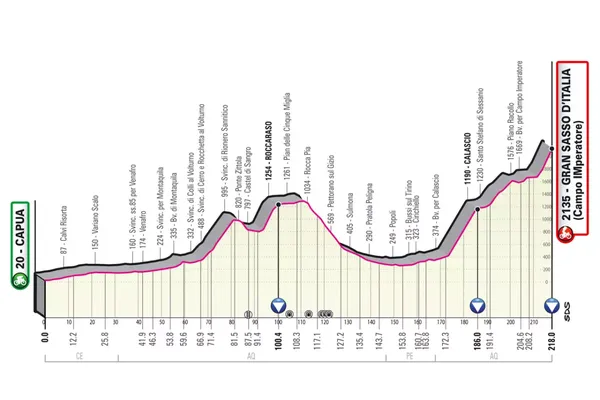 Le départ est donné à Capoue, près de Naples, puis le parcours s’enfonce dans les terres en traversant les Apennins du sud via Roccaraso, Piano delle Cinque Miglia et une longue descente jusqu’au pied de la montée de 45 km vers la haute plaine de Campo Imperatore. Un plateau à mi-hauteur offre un peu de répit, mais la pente monte en flèche dans les derniers kilomètres, les sections à 13% étant l’endroit idéal pour attaquer et gagner du temps.