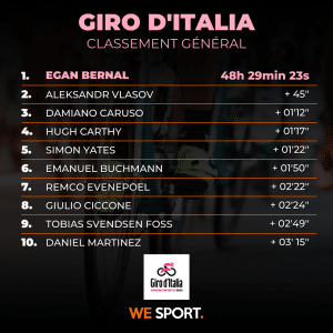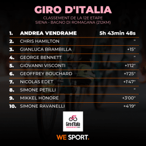 Dans cette douzième étape reliant Siena à Bagno di Romagana, c'est Andrea Vendrame qui s'impose. Le peloton lui a contrôlé, Egan Bernal reste en rose.