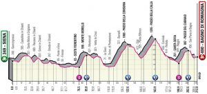 Un nouveau parcours escarpé se présente devant les coureurs aujourd'hui. C’est l’une des trois étapes les plus longues de cette 104e édition reliant Siena à Bagno di Romagana. 212 km loin d'être de tout repos. Au programme : 3500 m de dénivelé et quatre ascensions répertoriées. Après des attaques multiples et des chutes, un groupe d'une vingtaine de coureurs s'extrait du peloton. L'équipe Ineos-Grenadiers ne laisse pas partir les échappés et imprime un rythme très élevé. Le peloton est coupé en plusieurs morceaux. Après 65 km de bataille, un groupe de quatorze coureurs s'en va, le peloton fait rideau derrière.