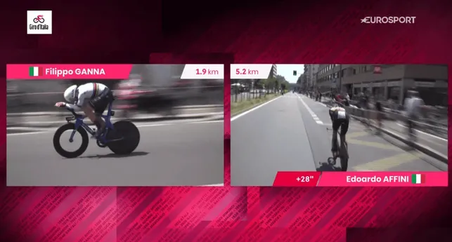 Le champion du monde boucle le deuxième intermédiaire en 21:55. Il devance de 32 secondes son premier poursuivant. Affini continue de concéder du temps. L’Italien de Jumbo-Visma passe au second intermédiaire à 30 secondes de son compatriote Ganna. Cependant, à un peu plus d’un kilomètre de l’arrivée, Filippo Ganna fait un signe à sa voiture, il s’arrête. L’Italien a crevé de la roue arrière. Le changement de vélo s’effectue rapidement et le coureur d’Ineos termine au sprint dans les rues de Milan. Les précieuses secondes perdues ne lui couteront pas le premier temps provisoire. La seule menace reste maintenant le Français Rémi Cavagna. En bouclant son contre-la-montre en 33:48, Filippo Ganna a couvert les 30 kilomètres à 53,8 km/h de moyenne.