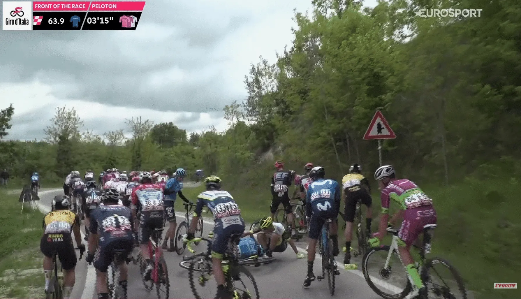 La vitesse décrite précédemment n’est pas sans conséquence sur la tension au sein du peloton notamment sur une route humide. Alors qu’on est sur le point de conclure la descente du Piancanelli pour le peloton, une chute importante se produit en milieu de peloton. Celui qui en fait les frais est le leader de l’équipe EOLO-Kolmeta, le sprinter italien Manuel Beletti qui semble souffrir en plein centre de la route.