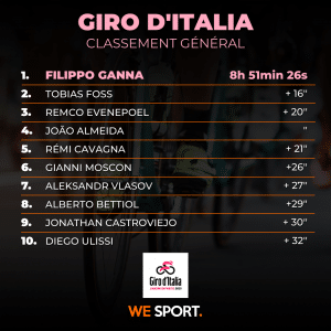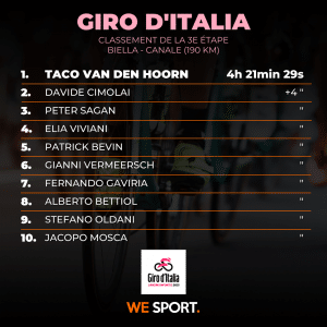 Au prix d'un énorme effort, Taco van den Hoorn s'impose. Le Néerlandais a tout donné, au prix d'une très belle partie de manivelle il remporte sa première victoire sur un grand tour. Filippo Ganna conserve son maillot rose sans réel souci.