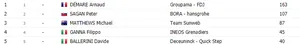 Mais quelques kilomètres plus loin, Fuglsang réintègre le peloton, qui cesse donc d’accélérer. Cela permet aux hommes de tête de reprendre de l’air. Les kilomètres passent et l’écart entre l’échappée et le peloton repasse au-dessus de la barre des dix minutes. On se dirige donc vers une victoire d’étape pour l’un des six échappés.