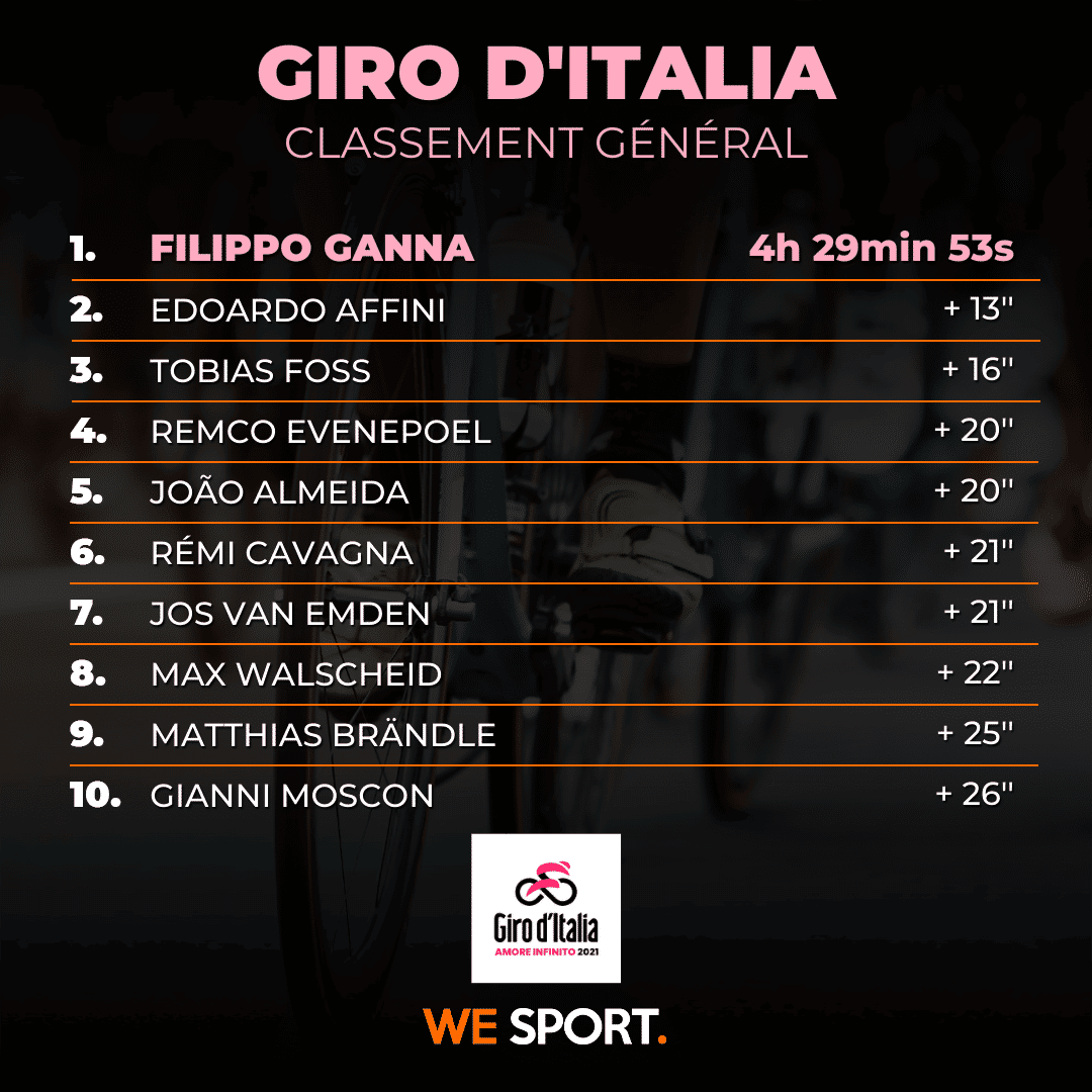 Filippo Ganna est toujours en rose. Il possède également le maillot blanc de meilleur jeune qui sera porté par Edoardo Affini. Vincenzo Albanese se pare de bleu et Tim Merlier s'habille en cyclamen. Les baroudeurs tenteront de ravir la tunique de leader du général au cours de deux prochaines étapes vallonnées.