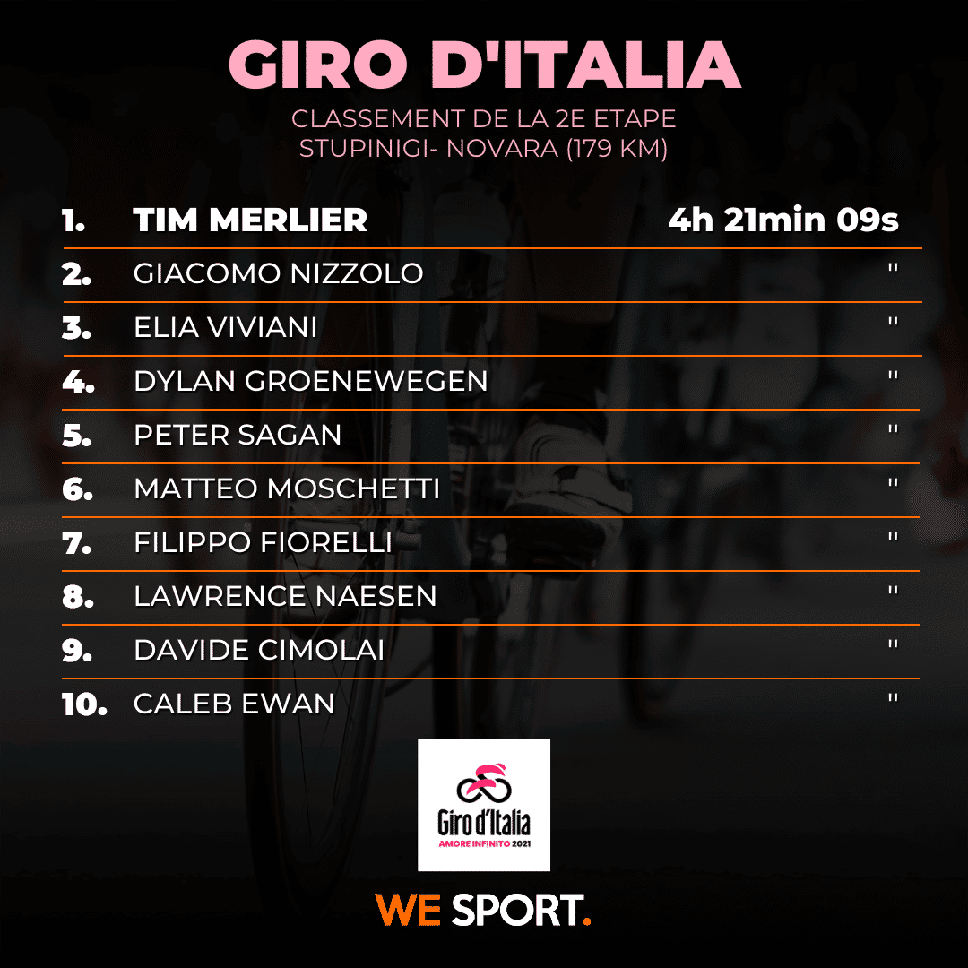 La deuxième étape du 104e Giro entre Stupinigi et Novara a débouché sur un sprint massif, le premier depuis neuf mois pour Dylan Groenewegen. Tim Merlier s'est imposé, son premier succès en grand tour. Filippo Ganna conserve son maillot rose.