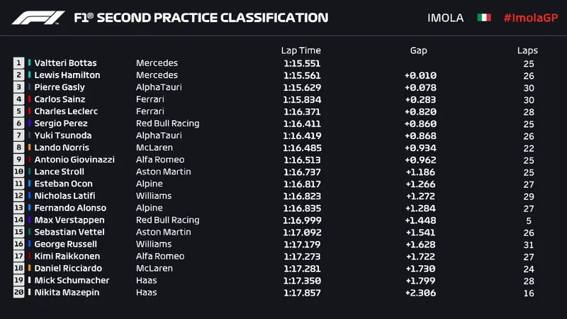 Valtteri Bottas récidive cet après midi. Le Finlandais de Mercedes signe le meilleur temps en 1 min 15 s 551. Il devance à nouveau son équipier Lewis Hamilton (+0.010s). Derrière ce duo, Pierre Gasly confirme les bonnes dispositions de son Alpha Tauri AT02, en se plaçant à 0.078s des Mercedes. De même pour les Ferrari qui se classent 4e et 5e. Après son incident de ce matin, Sergio Pérez signe un 6e chrono encourageant (+0.860s).