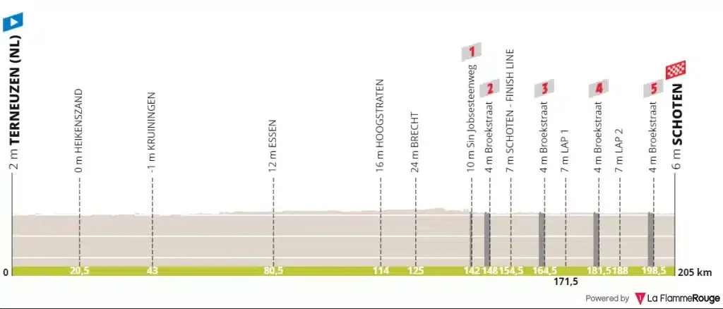 C’est aux environ de 13 h 00 que s’élancera de Terneuzen le 112ᵉ Grand Prix de l’Escaut. Au programme, 205 kilomètres et 5 secteurs pavés dans une boucle avant l’arrivée à Schoten. Le point majeur de la course, le secteur de Broeckstraat long de 1700 mètres.