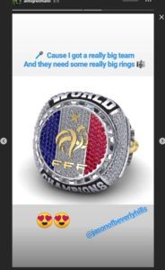 En tant que super fan de sport US et surtout de NBA, Antoine Griezmann veut lui aussi sa bague de champion ! En effet, à l’image de celle que reçoivent les vainqueurs de la NBA chaque année, Griezmann veut la sienne après son titre de Champion du Monde.