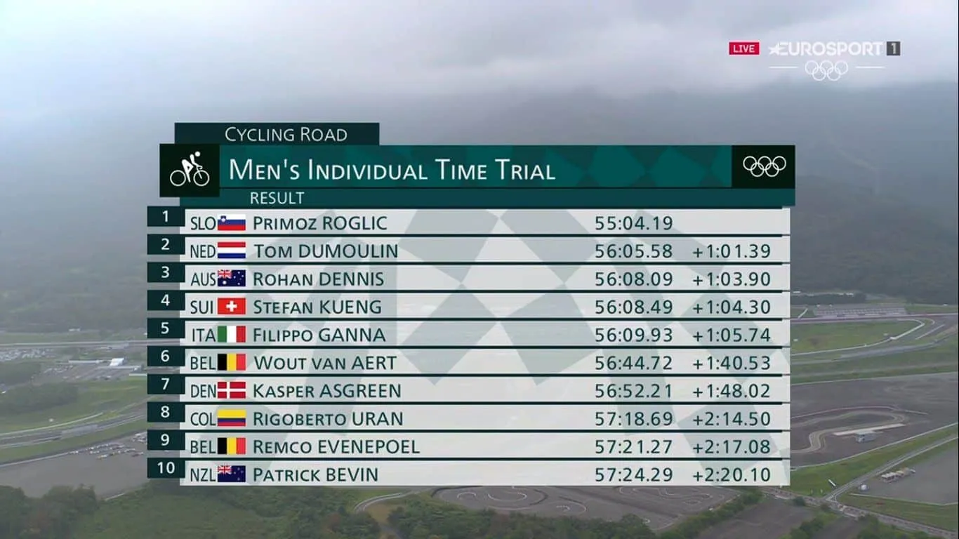 Au programme du jour, un parcours vallonné de 44,2 km taillé pour les purs rouleurs ayant des aptitudes de grimpeur. Sur les routes du circuit de Fuji et de ses alentours, les coureurs avaient à réaliser deux boucles de 22,1 km comprenant des montées, des descentes et très peu de plat. Au départ, nombreux sont ceux qui pouvaient prétendre à décrocher l’or, mais ce parcours atypique a remis tout le monde à sa place et a récompensé le plus fort. Parmi les prétendants, le champion du monde Filippo Ganna, Tom Dumoulin, Primož Roglič, Rohan Dennis, Wout van Aert, Rémi Cavagna ou encore Stefan Küng.