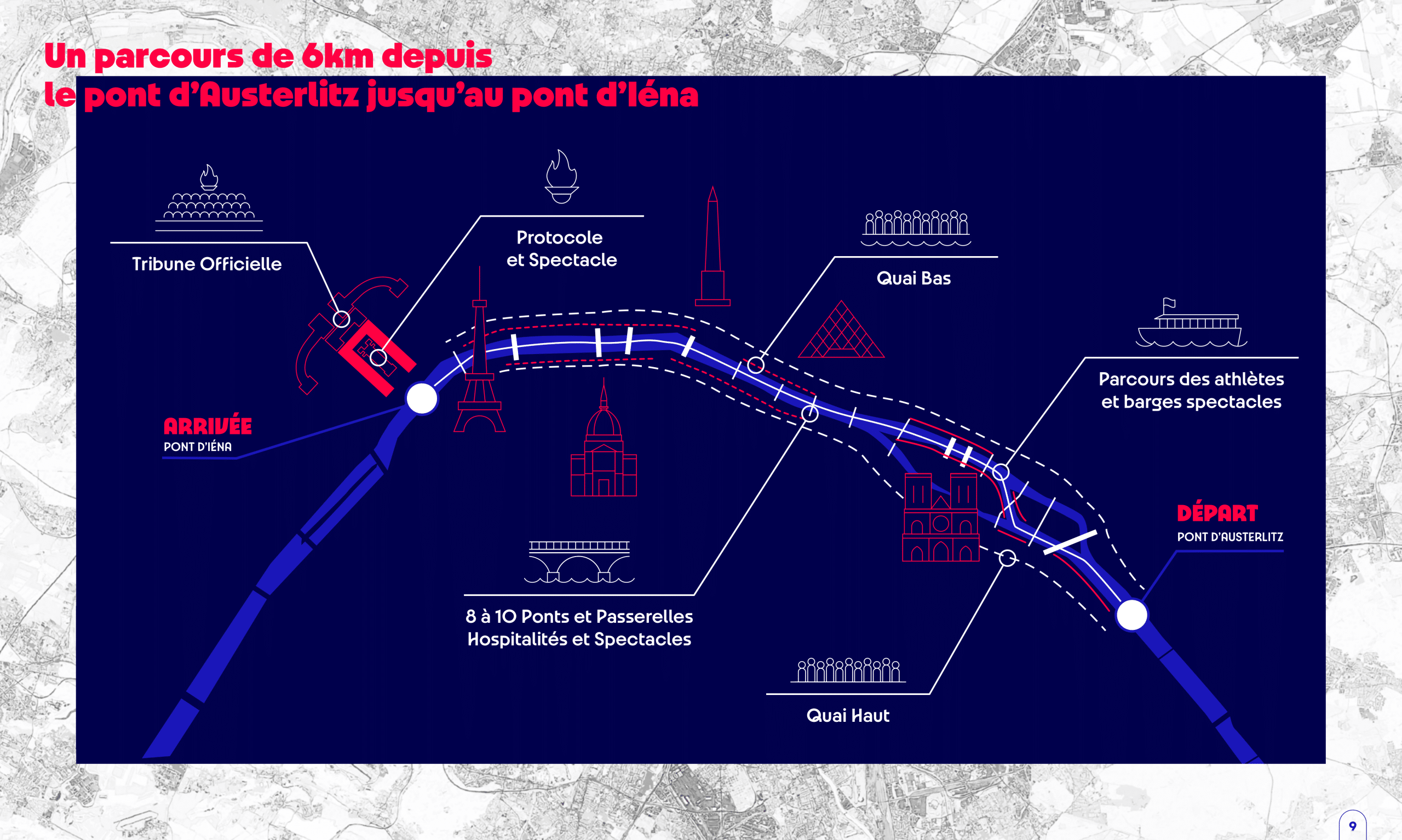 Pour la première fois de l'histoire des Jeux Olympiques, la cérémonie d'ouverture visitera les monuments de la ville hôte. Un parcours de 6km sur la Seine est prévu par les organisateurs reliant le pont d'Austerlitz au pont d'Iéna. L'occasion pour les 10 500 athlètes qui seront présents aux JO 2024 de découvrir les monuments et les ponts emblématiques de Paris.