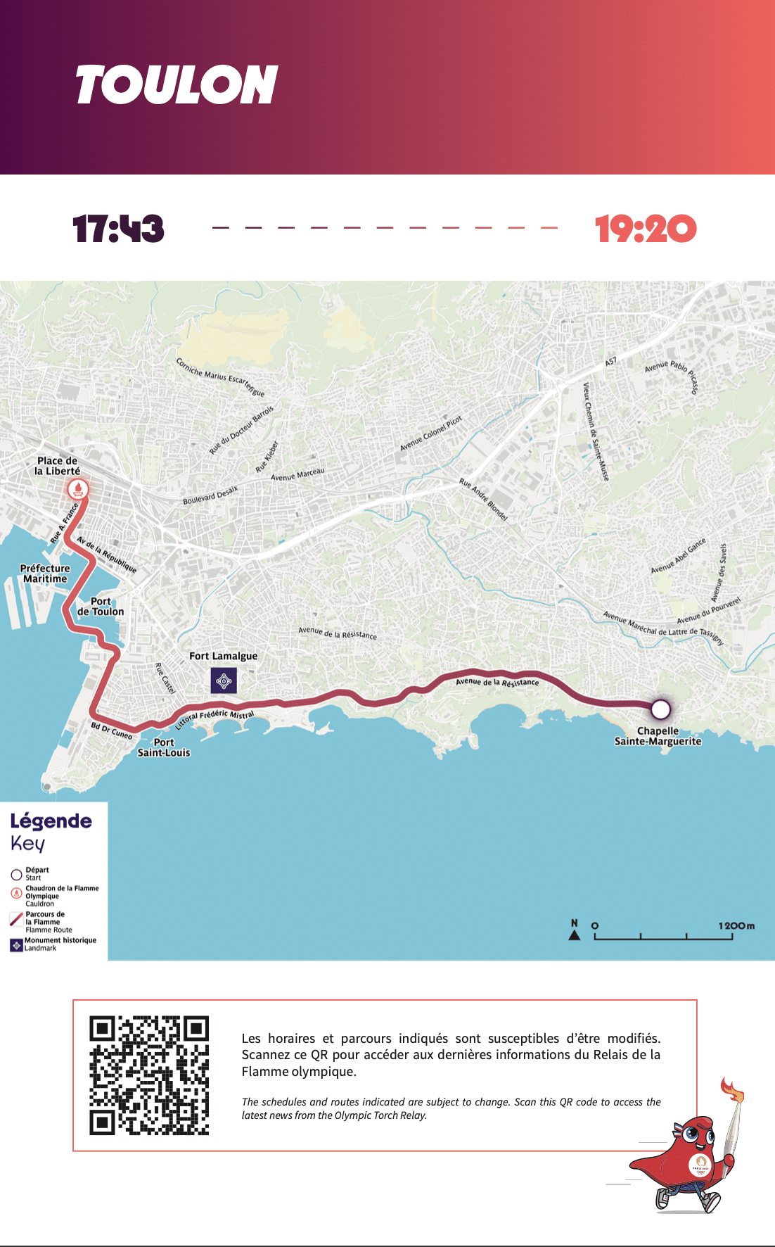 LE PROGRAMME ET HORAIRES DU RELAIS DE LA FLAMME OLYMPIQUE DU VENDREDI 10 MAI À TOULON