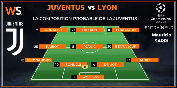 Sur le terrain, Gonzalo Higuain devrait être titulaire en pointe, avec Ronaldo à sa gauche et Cuadrado à sa droite. Matuidi devrait commencer sur le banc au profit d’un autre Français, Adrien Rabiot qui ne cesse d’impressionner depuis la reprise du championnat. Malgré certaines critiques à leurs égards, les deux latéraux Danilo et Alex Sandro devront selon toute vraisemblance être alignés.
