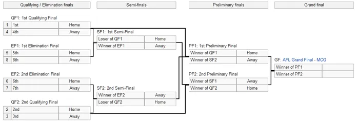 C’est la seule et unique ligue professionnel de football australien à ce jour. Créée en 1896 sous le nom de Victorian Football League (VFL), elle compte à ce jour dix-huit équipes réparties sur tout le territoire. La saison se déroule de fin mars à début septembre, avec quelques matchs de pré-saison entre février et mars. Chaque équipe dispute vingt-deux rencontres lors de la saison régulière, récoltant quatre points lors d’une victoire et deux lors d’un match nul. À la fin du calendrier, les huit meilleures équipes se qualifient pour un tournoi final, sorte de playoffs de l’AFL. Plutôt que de vous expliquer son fonctionnement, voici un schéma du tournoi final :