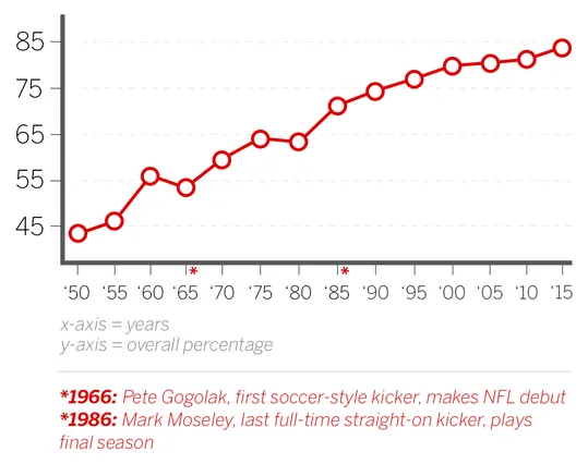 La réussite a également explosé sur les field goals longs (50+ yds), passant de 13,1 % dans les années 60 à 35,6 % dans les années 80 puis 65 % en 2015. Une preuve que toutes les modifications autour de la position ont profité au kick.