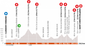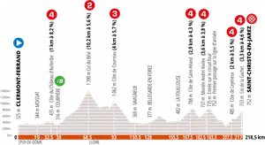Tracé entre Clermont-Ferrand et St-Christo-en-Jarez, cette première étape est la moins montagneuse de toutes. Toutefois, elle comporte de nombreuses ascensions, répertoriées ou non et est tout sauf propice à un sprint massif.