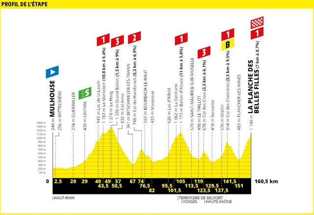 La septième étape fera place à une première explication entre les favoris en cette seconde étape Vosgienne. Le peloton aura six ascensions au menu du jour entre Mulhouse et l’arrivée au sommet à La Planche des Belles Filles après 160,5 kilomètres.