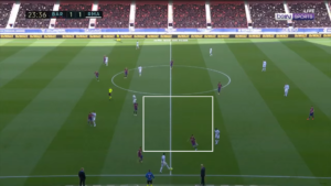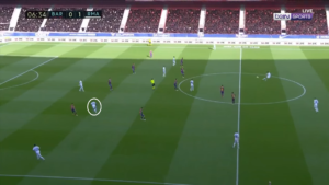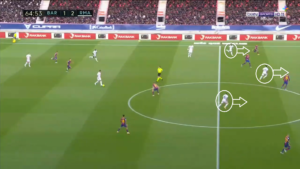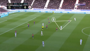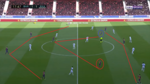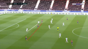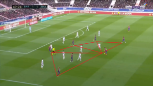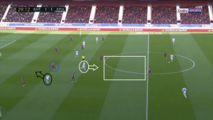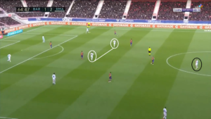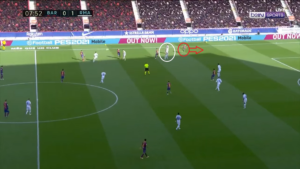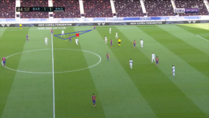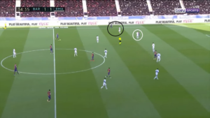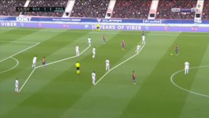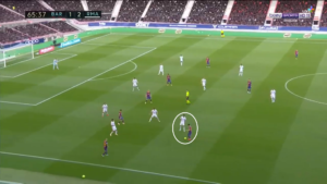 Un constat semblable s'applique lorsque Lionel Messi a le ballon dans une position reculée. Aucun joueur ne vient se placer entre les lignes, Ansu Fati étant immobile à la pointe de l'attaque.