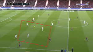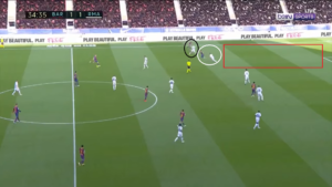 Les soucis de positionnement ne concernent pas que le côté droit madrilène. Sur cette séquence, la phase de transition défensive est mal gérée et offre une situation de trois contre deux au Barça.