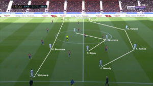 Ce dispositif laisse notamment une part de liberté à Casemiro dans son positionnement, lui permettant d'aller cadrer Lionel Messi (cercle blanc) malgré ses nombreux décrochages.