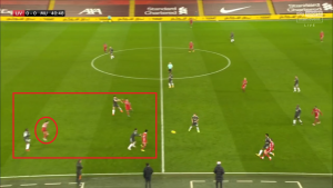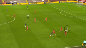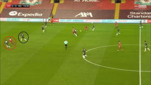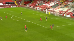 Ici, c’est le meneur de jeu Bruno Fernandes (cercle noir) qui est complètement oublié par l’arrière-garde de Liverpool. Trent Alexander-Arnold (cercle rouge) et Curtis Jones (cercle blanc), entré en jeu, sont très en retard dans le repli défensif.