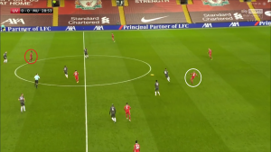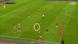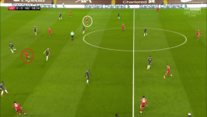 Les décrochages du trio offensif permettent à Liverpool de se procurer plusieurs occasions de but. Les mouvements de Sadio Mané et Mohammed Salah attirent les défenseurs adverses et libèrent des espaces pour leurs partenaires. Ici, l'Egyptien (cercle blanc) attire la pression dans une position plutôt basse et permet à Thiago Alcantara (cercle rouge) d'avoir du champ dans le demi-espace.