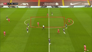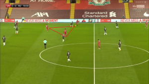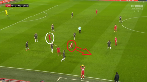Dans leur organisation en possession du ballon, les Reds misent sur une présence importante dans les demi-espaces. À la relance, ils profitent de la faible pression mancunienne et de la qualité de passe de Jordan Henderson pour permettre à Andy Robertson (cercle rouge) de se placer beaucoup plus haut dans cette zone.