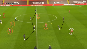 Rapidement, la maîtrise du ballon est acquise à Liverpool qui évolue souvent dans le camp adverse. Cette attitude permet à Jordan Henderson et Fabinho (cercle rouge), à l’aise techniquement, d’avancer balle au pied et d’attaquer les espaces face à eux.