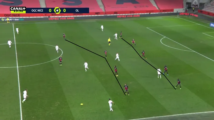 Dès le début de la rencontre, Nice met en place un 5-4-1 pour annihiler les offensives lyonnaises.