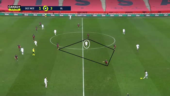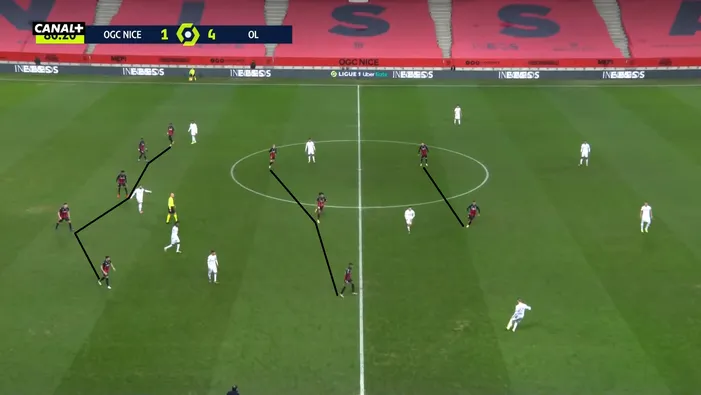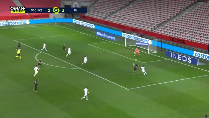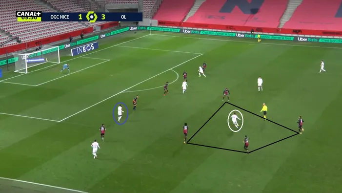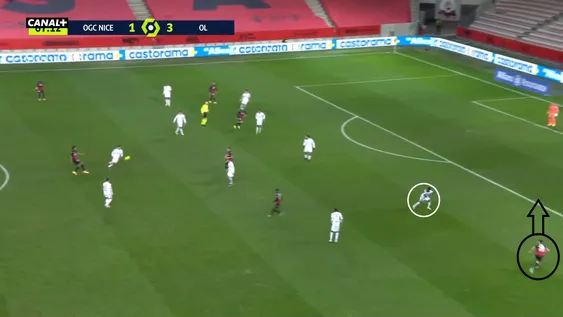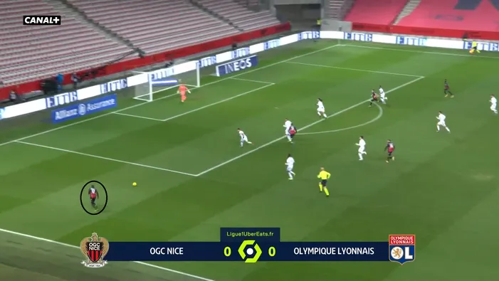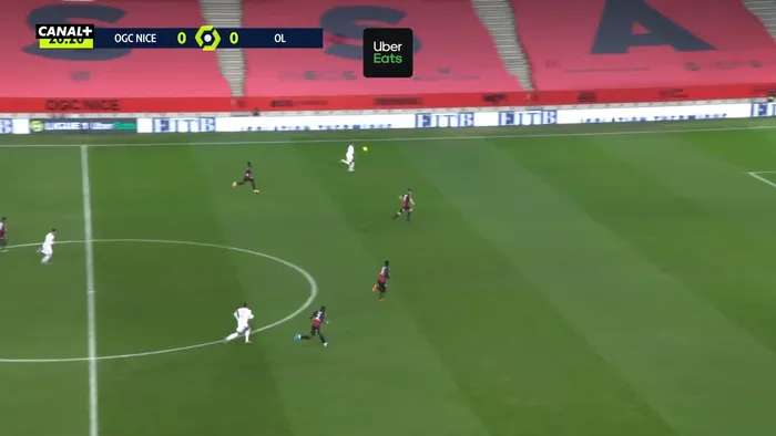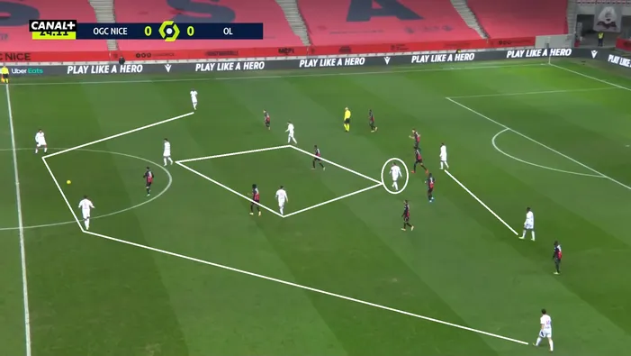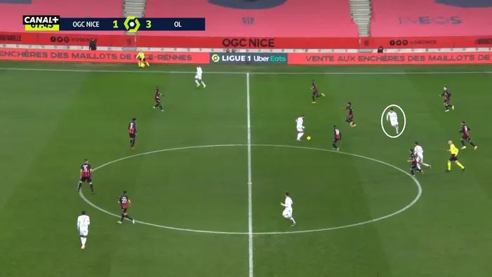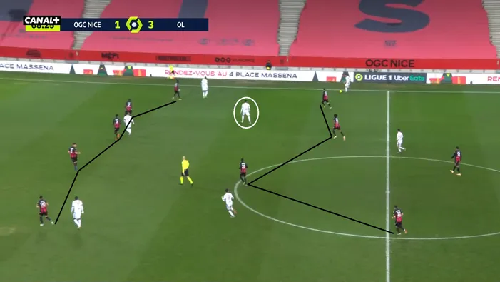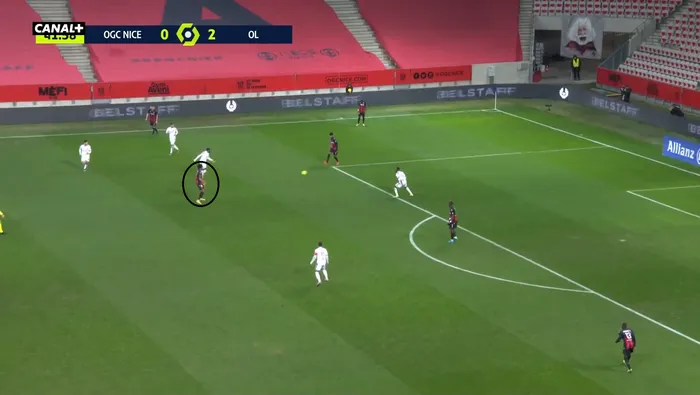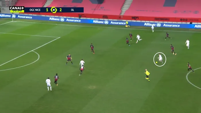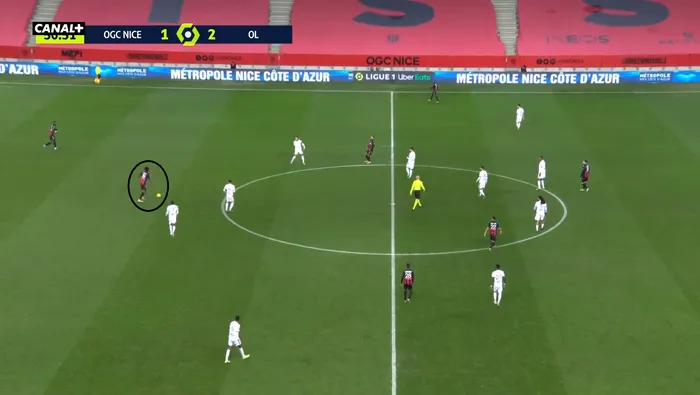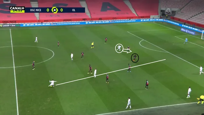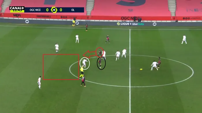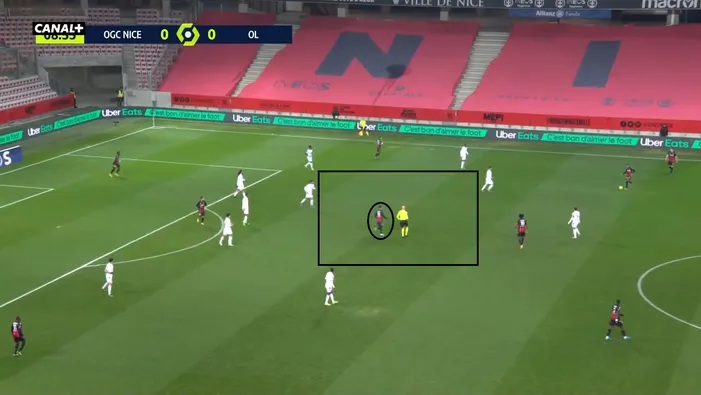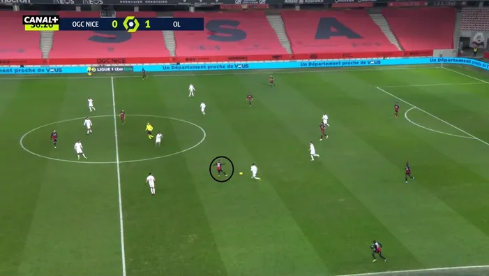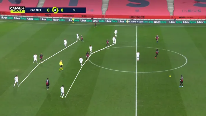 De plus, Nice s’avère finalement dépassée dans sa gestion de l’entrejeu. De nombreux espaces axiaux sont laissés aux Rhodaniens qui les attaquent parfaitement, comme Bruno Guimaraes (cercle blanc) sur cette phase de jeu.