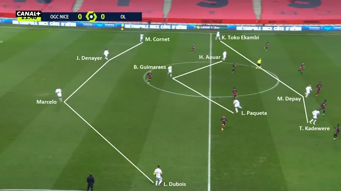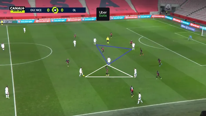 La supériorité numérique de l’OL dans l’entrejeu offre tout de même de nombreuses formations de triangles dans la circulation du ballon. Les transmissions sont facilitées par les qualités techniques de Bruno Guimaraes, Lucas Paqueta et Houssem Aouar.