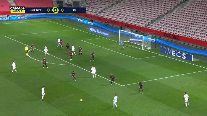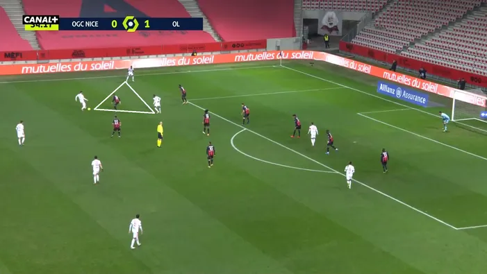 Ces triangles créent de plus en plus d’espaces au sein d’un bloc azuréen qui se délie au fil des minutes. L’OL parvient notamment à déséquilibrer Nice en passant par les côtés.