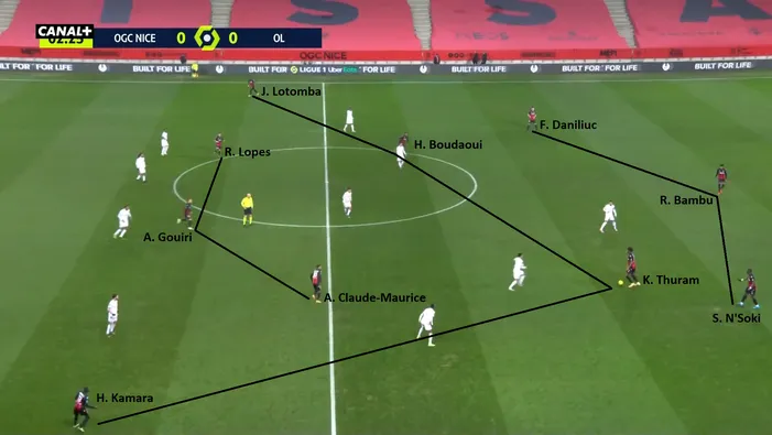 Amine Gouiri (cercle noir) est particulièrement précieux dans l’animation niçoise. Ses déplacements entre les lignes font de lui une solution facilement trouvable par ses partenaires.