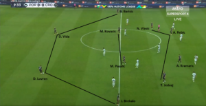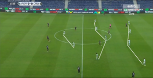 Cette grande mobilité concerne également les milieux de terrain, en particulier Bruno Fernandes. Le déplacement permanent des champions d’Europe 2016 permet une occupation quasi-optimale des espaces, avec la mise en place de nombreux triangles dans la circulation courte du ballon entre les lignes.