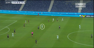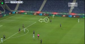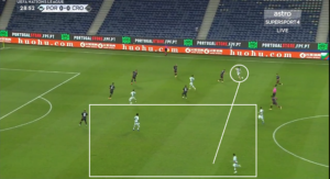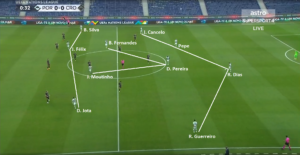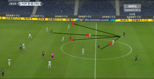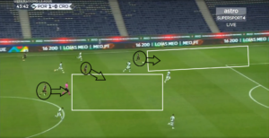 Sans le ballon, le joueur formé à Benfica (cercle blanc) adopte à plusieurs reprises une attitude de meneur de jeu en demandant le ballon entre les lignes et dans le demi-espace.