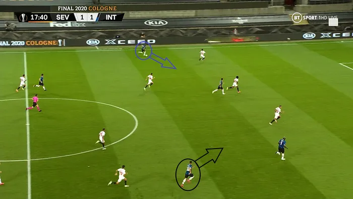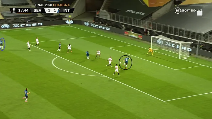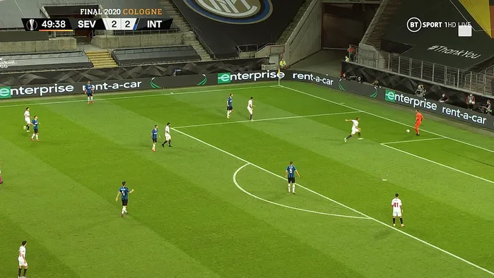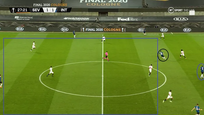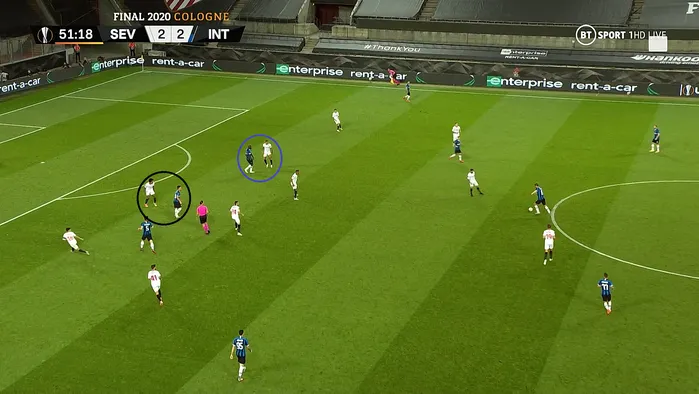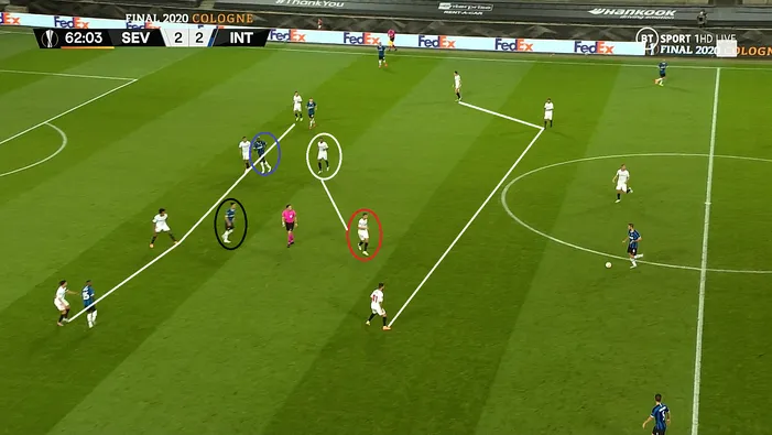 Le positionnement haut de Séville à la perte du ballon empêche d’autant plus la relance courte de l’Inter.