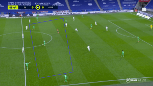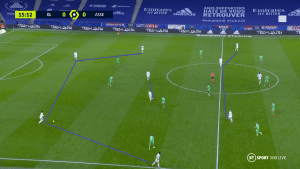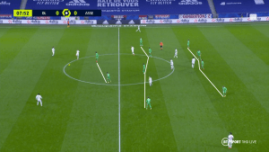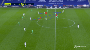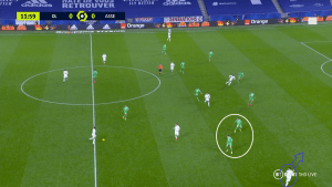 Appliqués tactiquement, les Stéphanois ferment les espaces et coupent les différentes lignes de passe lyonnaises. Le bloc est compact et ne laisse que très peu d’opportunités à l’OL pour faire circuler le ballon.