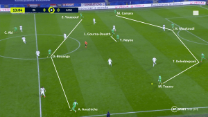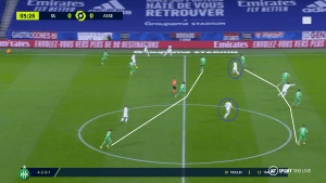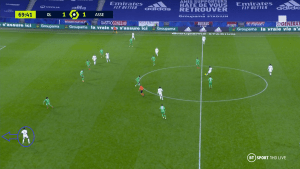 Surtout, les Verts sont facilement trouvés sur les ailes et dans les demi-espaces. Les transmissions de l’extérieur vers l’intérieur sont mal contenues par l’arrière-garde lyonnaise. Ici, la mauvaise communication entre les défenseurs laisse Denis Bouanga seul dans la surface de réparation. Le Gabonais ouvrira la marque quelques secondes plus tard.