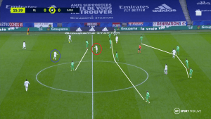 Dans ce nouveau dispositif, Bruno Guimaraes et Maxence Caqueret forment le double pivot. Le Brésilien (cercle bleu) se rapproche régulièrement de ses défenseurs centraux pour aider à la relance, tandis que son partenaire (cercle rouge) se place entre les deux premières lignes stéphanoises.