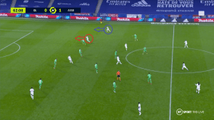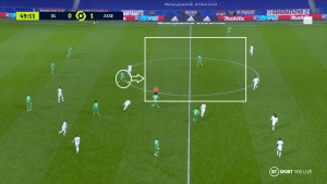 En possession du ballon, les Verts ont en revanche des difficultés pour progresser sur le terrain. Des mouvements manquent pour assurer la sortie du ballon, comme ici où les partenaires d'Harold Moukoudi (cercles blancs) n'essaient pas de se défaire du marquage lyonnais pour rejoindre un espace libre et faciliter la passe.