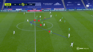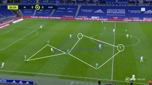 De nombreux espaces sont également laissés dans le dos latéraux rhodaniens. Sur cette séquence, Denis Bouanga (cercle blanc) part dans le dos d'un Maxwel Cornet (cercle bleu) qui gère mal la profondeur. Yvan Neyou lance parfaitement son partenaire dans la zone libre.