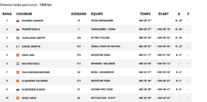 Premier attaquant, Enric Mas est allé jusqu'au bout et s'offre une très belle deuxième place. Impressionnant sur la fin d'ascension, Carthy s'est détaché à 1 gros kilomètre de l'arrivée au moment où Roglič montrait de grands signes de faiblesse. Inquiétant tout le long de l'ascension, Carapz récupère 12” sur le Slovène. Martin perd du temps mais arrive tout de même avec le dernier deuxième du Tour de France.