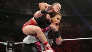 Alors qu’elle ne possède qu’un seul match à son actif (match en équipe qui plus est), Ronda Rousey se voit challengée par la championne, Nia Jax, qui lui propose d’être sa future adversaire. Ni une, ni deux, la rookie accepte, obtenant alors sa première opportunité au titre de championne de Raw dès son premier match en un contre un. Ce match prend place à Money In The Bank. Plutôt convaincant, il se finit finalement sans véritable vainqueur puisque Alexa Bliss a eu la bonne idée d’encaisser sa mallette pendant le match, remportant le titre de championne de Raw, sous le nez d’une Ronda Rousey énervée.