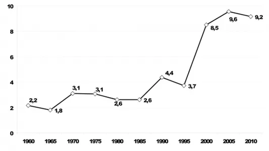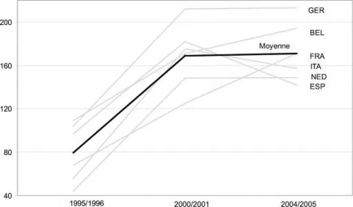 En effet, le nombre de joueurs étrangers présents en Ligue 1 n’a cessé de croître au fil des années. S’il a connu une période de grande stabilité jusqu’à la fin des années 1980 à cause des quotas en vigueur, un premier changement intervient lorsque la présence de deux joueurs assimilés est admise, en plus des trois joueurs étrangers initialement autorisés. Mais en 1995, la proclamation de l’arrêt Bosman engendre une explosion du nombre de footballeurs étrangers évoluant dans l’Hexagone, comme le montre le graphique ci-dessous.