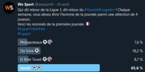 Qui dit retour de la Ligue 1 dit retour du Grande Rougador. Pour ce premier épisode, Da Silva, El Bilal Touré, Philippoteaux et Gouiri étaient nominés. C’est finalement le buteur de Nice qui a été choisi.