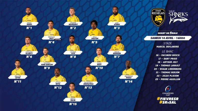 Le Stade Rochelais s’apprête à disputer un quart de finale de Champions Cup pour la deuxième fois de son histoire. Impressionnants en Top 14, les Jaune-et-Noir ont confirmé sur la scène européenne en dominant Gloucester avec autorité vendredi dernier (16-27). Ils auront une très belle carte à jouer ce week-end à domicile, face à un adversaire disposant de deux jours de repos en moins. C’est en effet dimanche que les Anglais de Sale ont surclassé les Scarlets (14-57) au Pays de Galles. Actuellement 3e de Premiership, les Sharks réalisent une bonne saison et la partie s’annonce équilibrée.